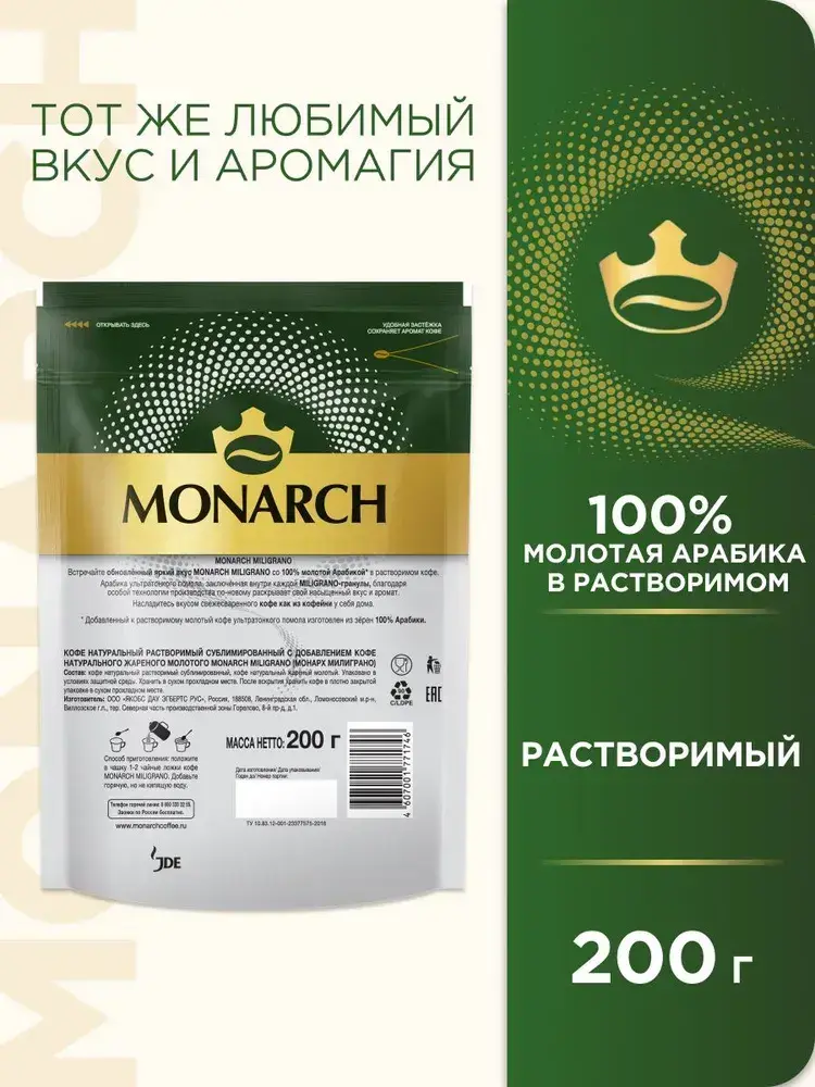 Кофе растворимый Monarch Miligrano, с молотым, 200 г