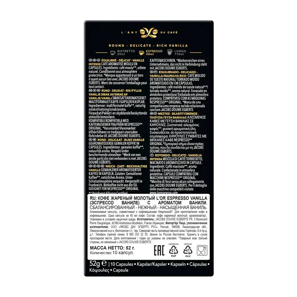 Кофе в капсулах L'OR Espresso Vanilla, с ароматом ванили, для кофемашины Nespresso, арабика, 10 шт