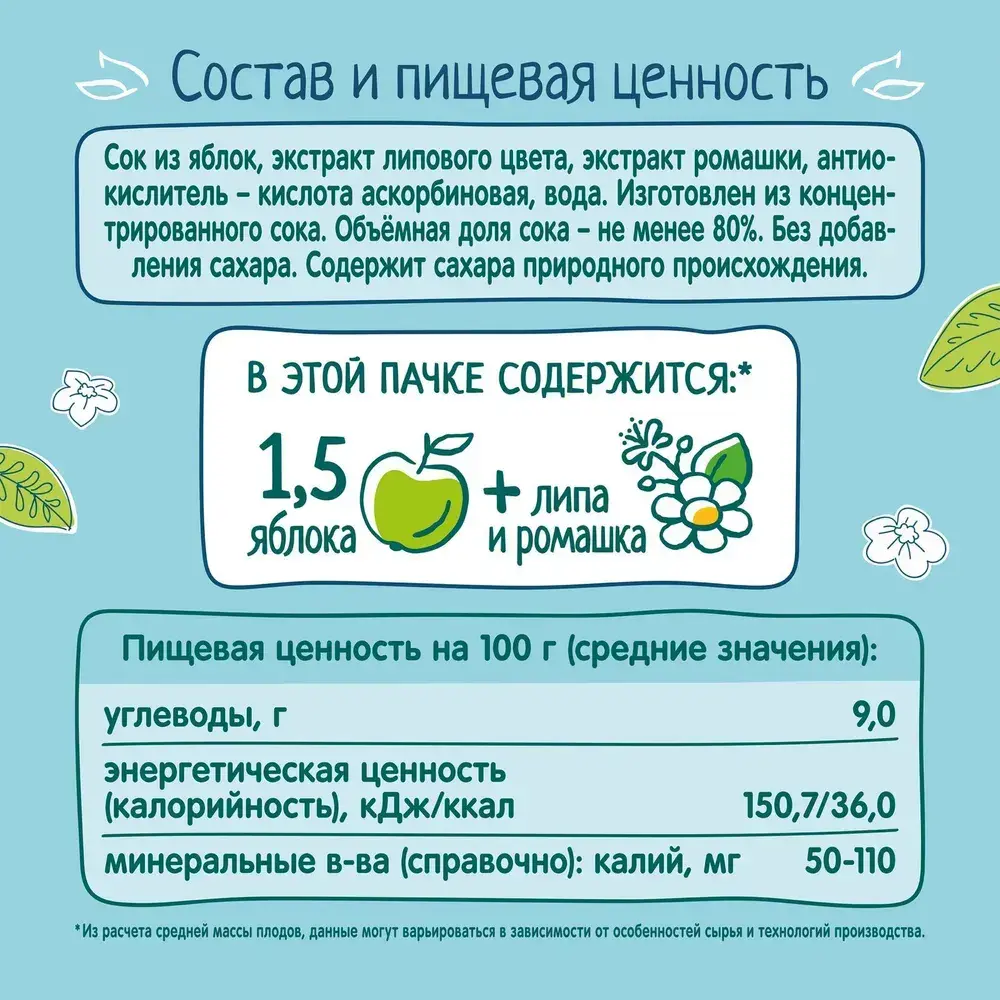 Сок детский ФрутоНяня, из яблок с липой и ромашкой, 0,2 л