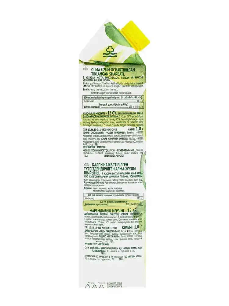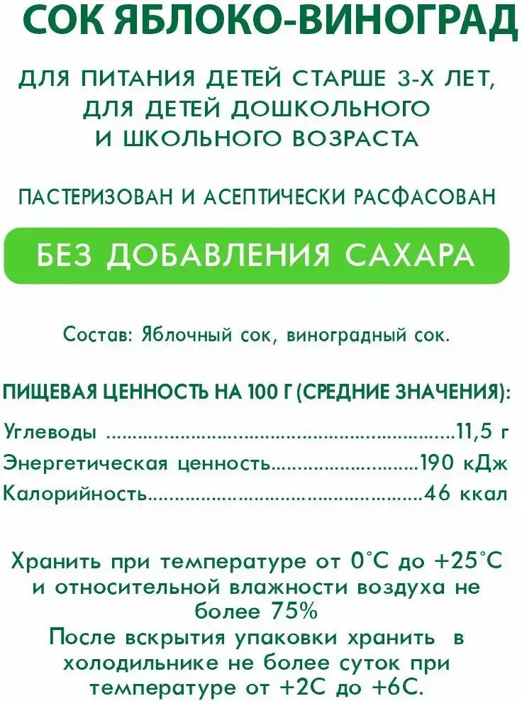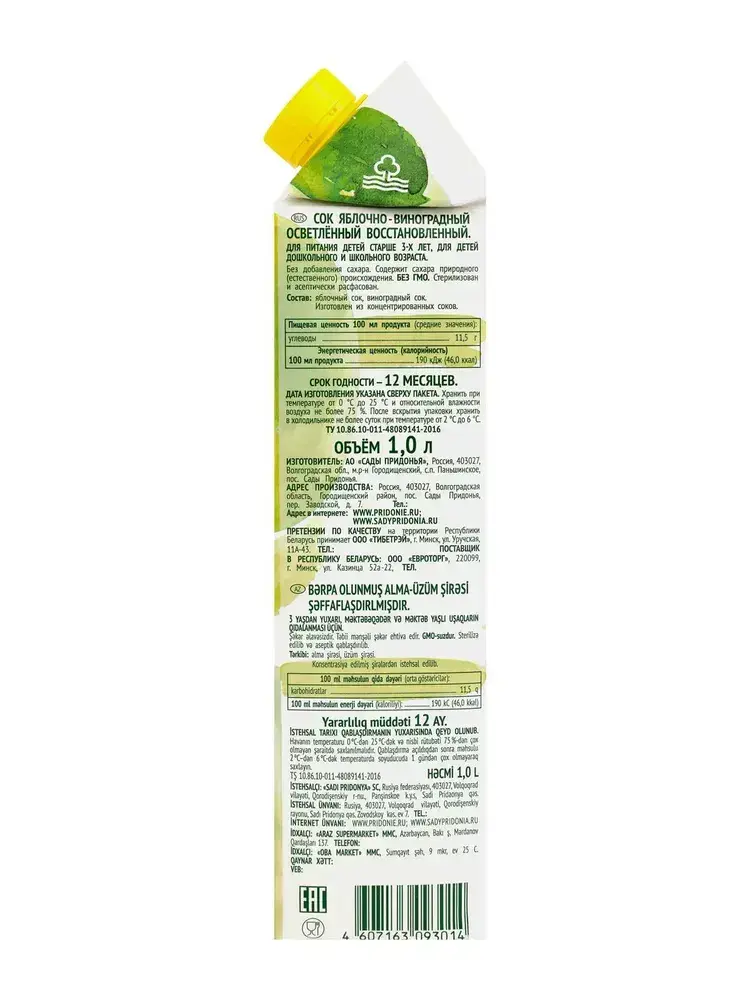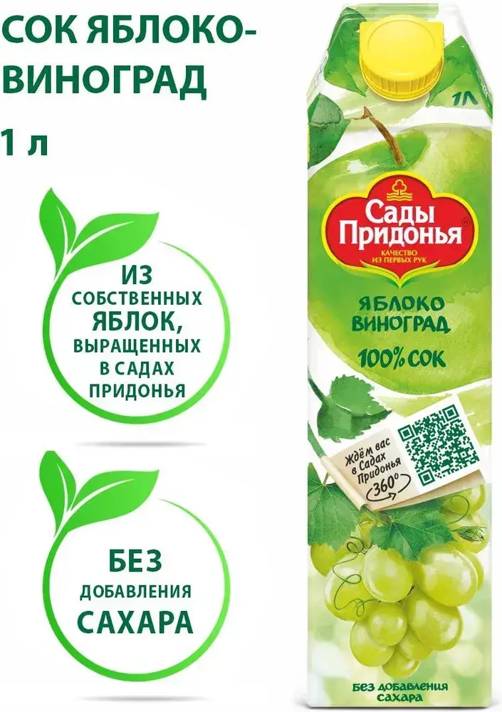 Сок Сады Придонья Яблочно-Виноградный, осветленный, восстановленный, 1 л