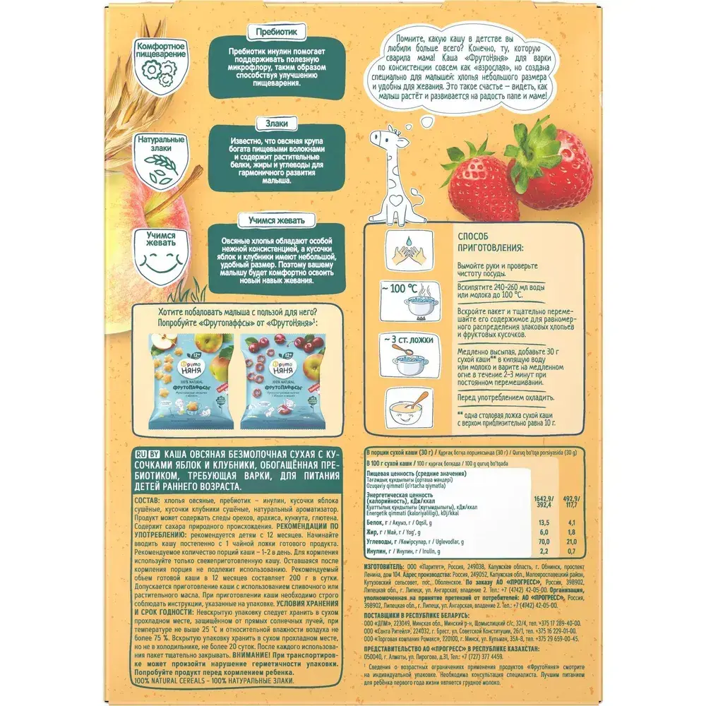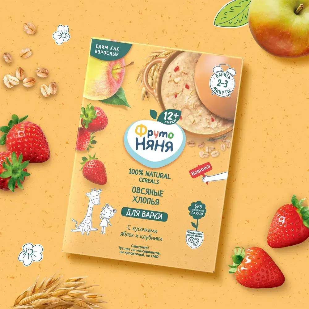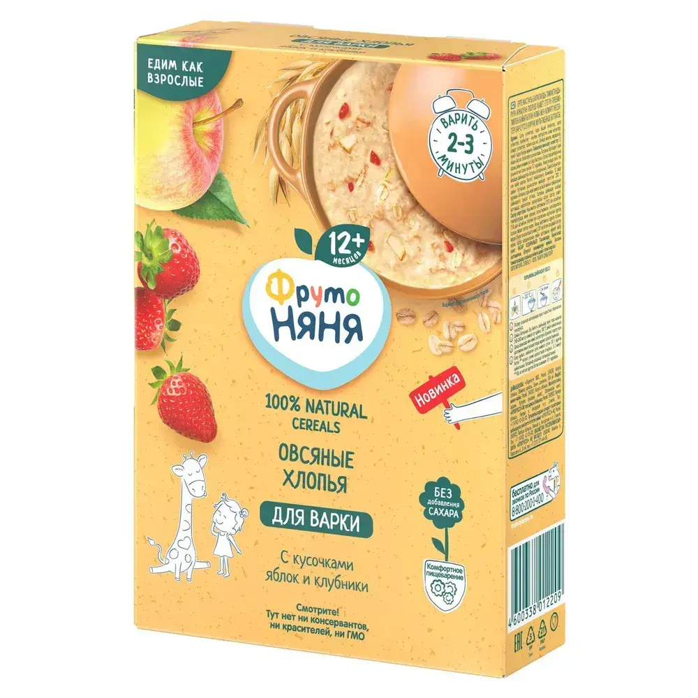 Сухая каша ФрутоНяня безмолочная овсяная с кусочками яблок и клубники, для варки, 200 г